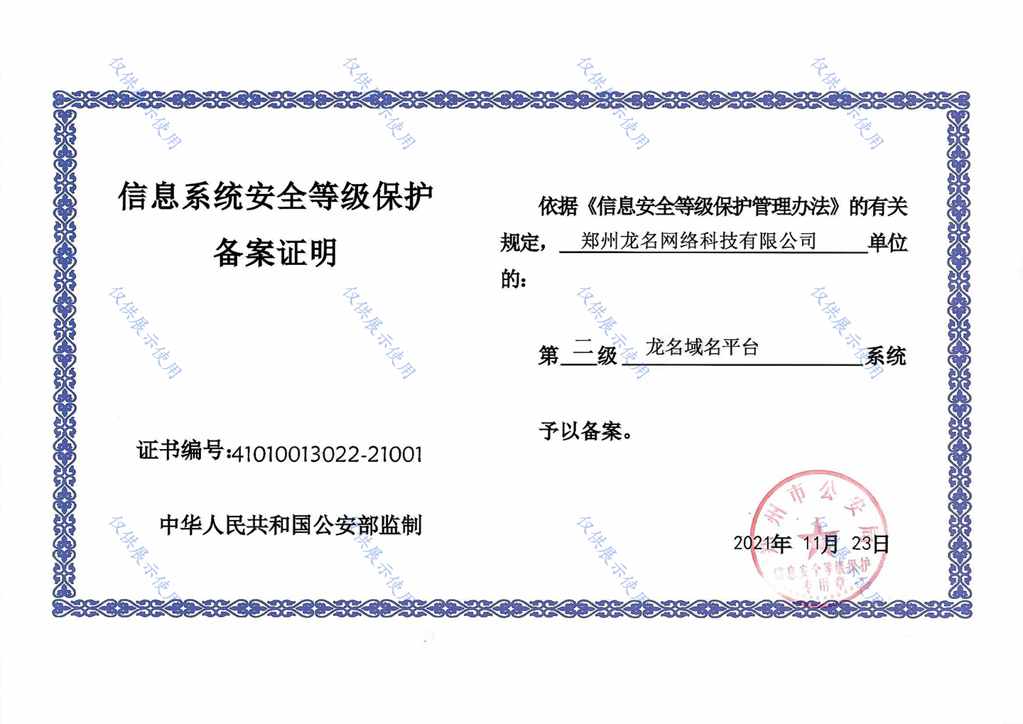 信息系统安全等级保护备案证明