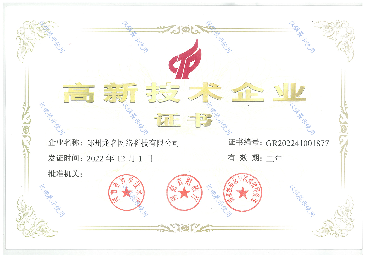 高新技术企业证书