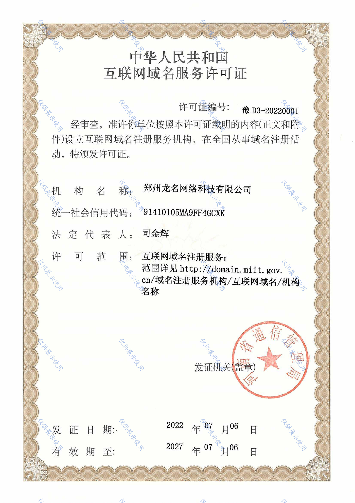 中华人民共和国互联网域名服务许可证