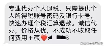 骗子会通过电话或者短信:“只要提供个税APP账号密码和银行卡号,我们就可以帮忙操作办理个税汇算退税,按退税到账金额比例支付服务费,若没有成功不收取费用!”
