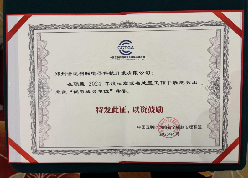 本届大会上,龙名旗下郑州世纪创联电子科技开发有限公司凭借在2024年度恶意域名处置工作中的突出表现,荣获“优秀成员单位”称号。这一殊荣不仅仅是对我们过去一年工作的肯定,更是对公司工作的鼓舞。