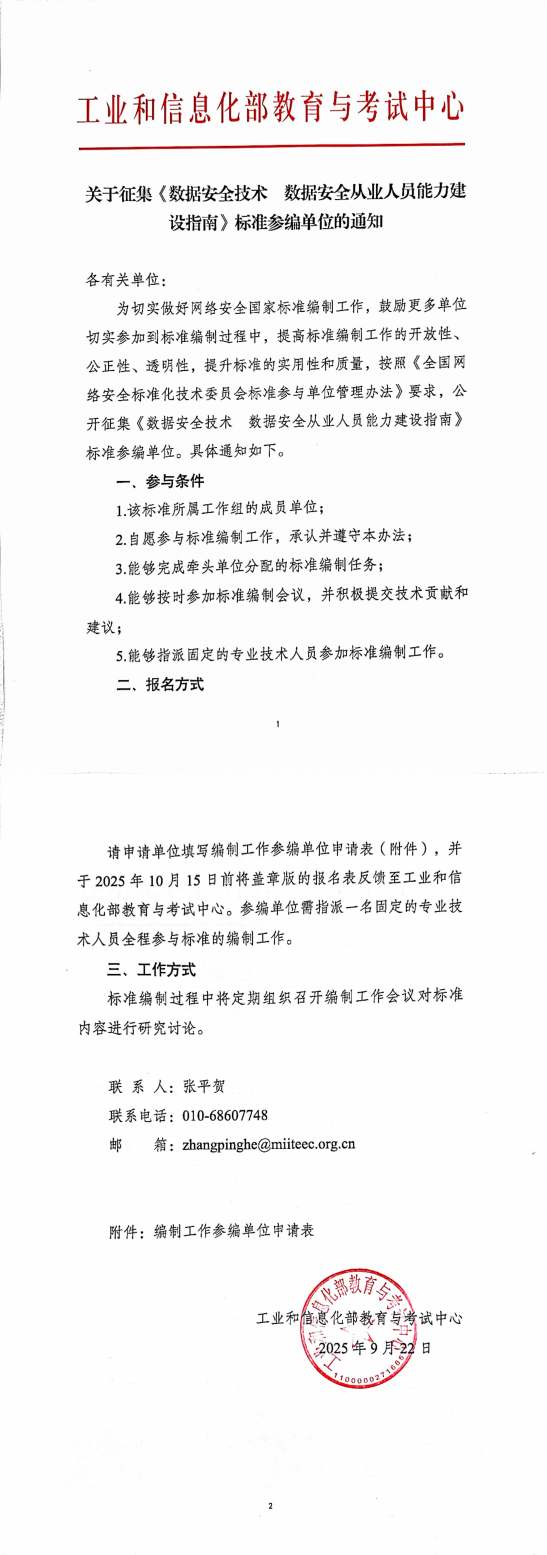 关于征集《数据安全技术 数据安全从业人员能力建设指南》标准参编单位的通知 发表于:2025-09-23 来源:全国网络安全标准化技术委员会 2025-09-23附件1:征集参编单位通知(模板).docx 上一篇:关于征集《网络安全技术 人工智能安全能力成熟度评估方法》标准参编单位的通知 下一篇:关于征集《网络安全技术 人工智能安全能力成熟度评估方法》标准参编单位的通知