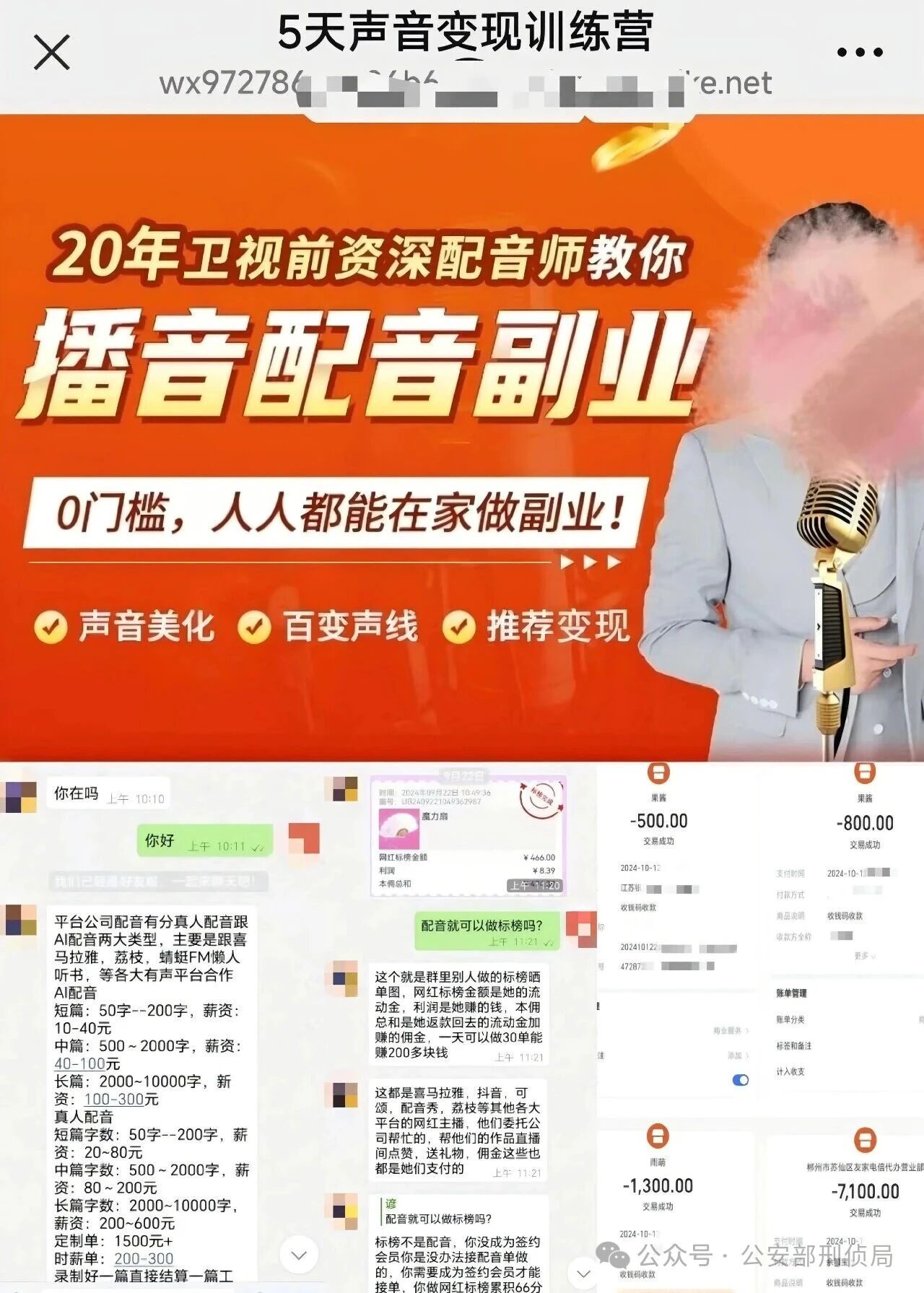诈骗分子会在社交平台以及网络直播间中,发布投资理财课程、无门槛兼职、高薪赴境外工作等内容的视频。在获得受害人关注后,诈骗分子会在评论区或者直播弹幕中发布“想了解更多,私信联系客服”等评论,引诱受害人越过官方平台加入所谓的“投资指导群”“配音群”“兼职群”“课程群”,进而实施诈骗。这种引流手段更具有迷惑性,有些甚至会铺垫几个月的时间,当你放松警惕之后才实施诈骗。不要轻信社交平台中短视频发布的内容。