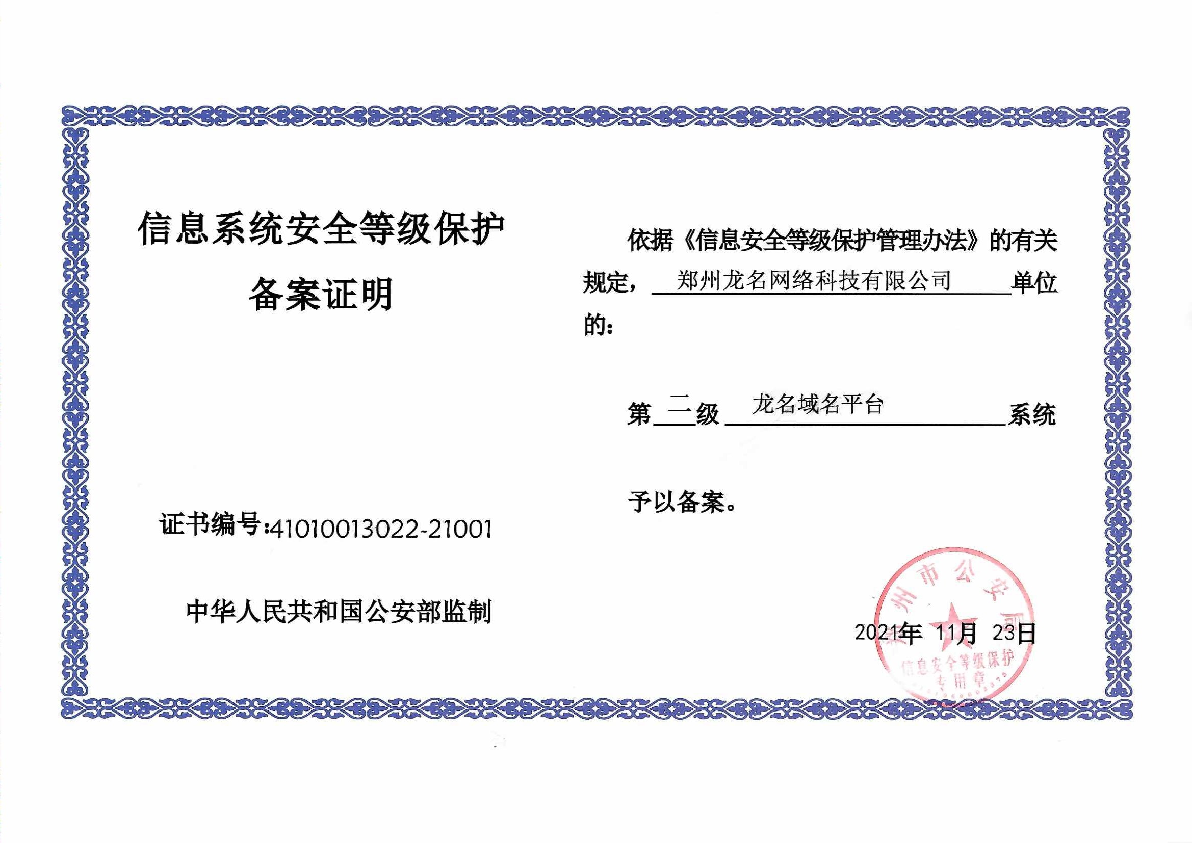近日,龙名科技旗下子公司郑州龙名网络科技有限公司的龙名域名平台顺利通过国家信息系统安全等级保护备案审查,在技术、系统管理、应急保障等方面都达到了国家标准,正式获得公安部核准颁发的“信息系统安全等级保护”二级证书。